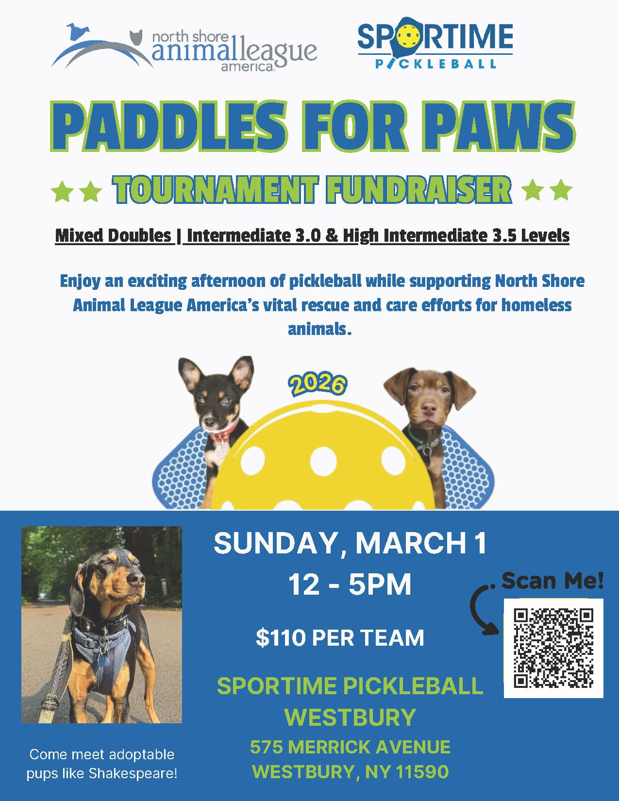 Enjoy an exciting afternoon of pickleball while supporting North Shore Animal League of North America's vital rescue and care efforts for homeless animals.
